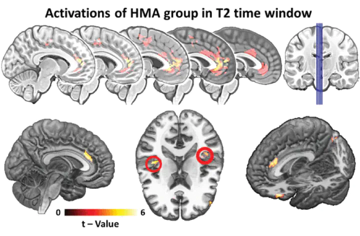 Illustration of areas where HMA have significantly greater activity in the T2 time window. (Top) areas extracted by the main effect of Group; note that HMA group has significantly greater activity in the ACC, as well as, in the supplementary motor area (SMA). (Bottom) results of the Group × Task interaction. HMA has significantly greater activity in the ACC and (bilaterally) in Insula.